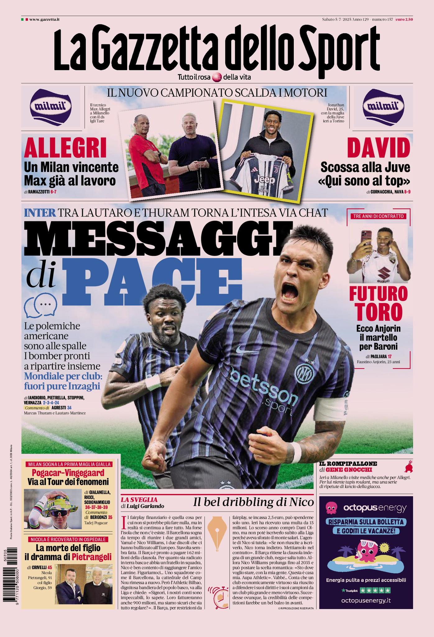 I rossoneri si sono ritrovati, per buona parte, ieri a Milanello per i test fisici propedeutici alla nuova stagione: Massimiliano Allegri già molto carico. La Juventus, invece, ha annunciato l'arrivo dello svincolato Jonathan David, ex Lille, con il quale rinforza il proprio attacco.
