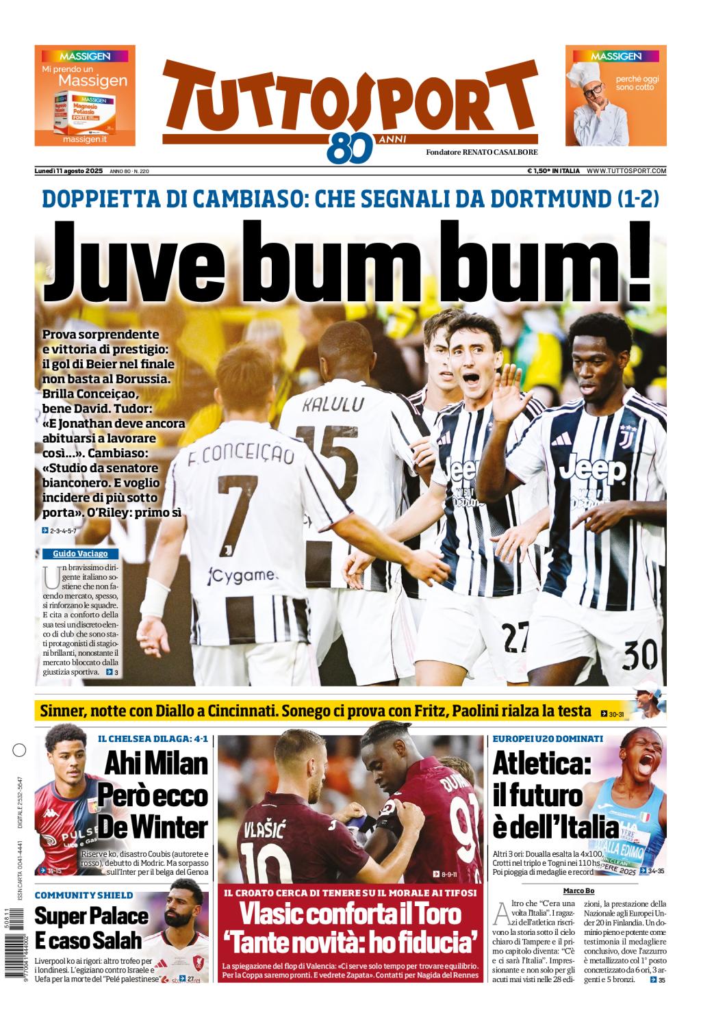 Male, invece, il Milan, che crolla 4-1 sul campo del Chelsea giocando per 72' con l'uomo in meno. Il debutto di Luka Modrić la nota meno amara della giornata. Al posto di Malick Thiaw, che giocherà nel Newcastle in Premier League, i rossoneri ingaggiano Koni De Winter dal Genoa.