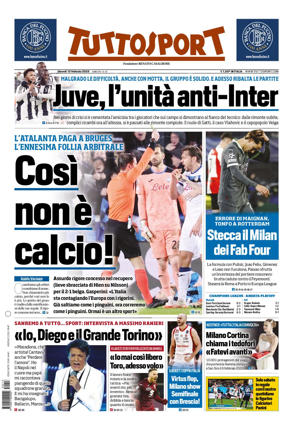 Questa è la prima pagina di 'Tuttosport', in edicola oggi, giovedì 13 febbraio 2025. Diamo un’occhiata alle principali novità sul mondo dello sport e in particolare del calcio, cercando di evidenziare le notizie sul Milan.
