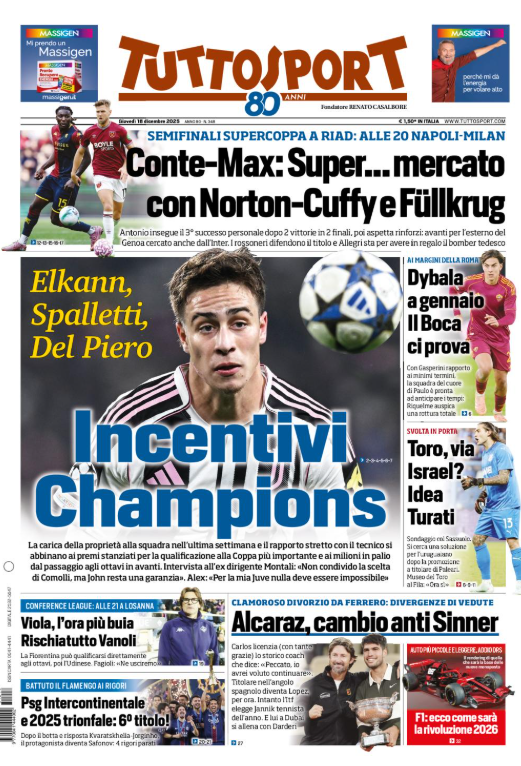 Questa è la prima pagina del 'Tuttosport', in edicola oggi, giovedì 18 dicembre 2025. Diamo un’occhiata alle principali novità sul mondo dello sport e in particolare del calcio, cercando di evidenziare le notizie sul Milan.