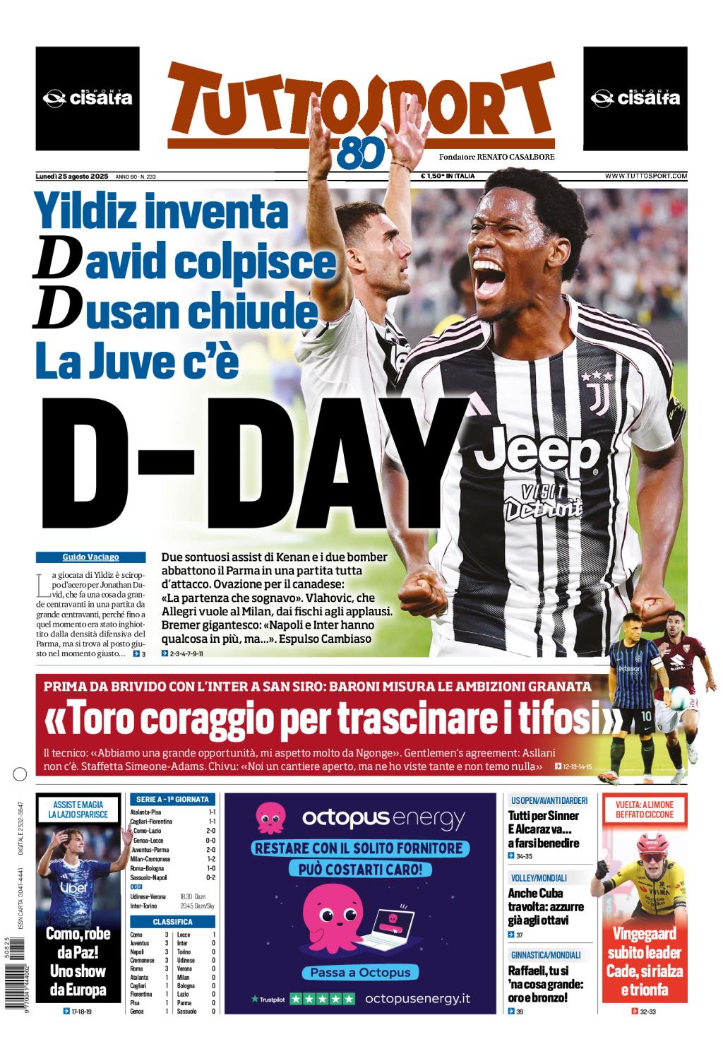 Prima con il brivido, invece, per il Torino di Marco Baroni che, questa sera, alle ore 20:45, farà il suo debutto in campionato sfidando a 'San Siro' la nuova Inter di Cristian Chivu. Mancherà, nelle fila dei granata, il fresco ex Kristjan Asllani. In attacco staffetta tra Giovanni 'Cholito' Simeone e Che Adams. Chiosa, poi, con il commento alla vittoria, sempre per 2-0, del Como di Cesc Fàbregas sulla Lazio di Maurizio Sarri: assist sublime e gol incredibile di Nico Paz. Che show del trequartista lariano!
