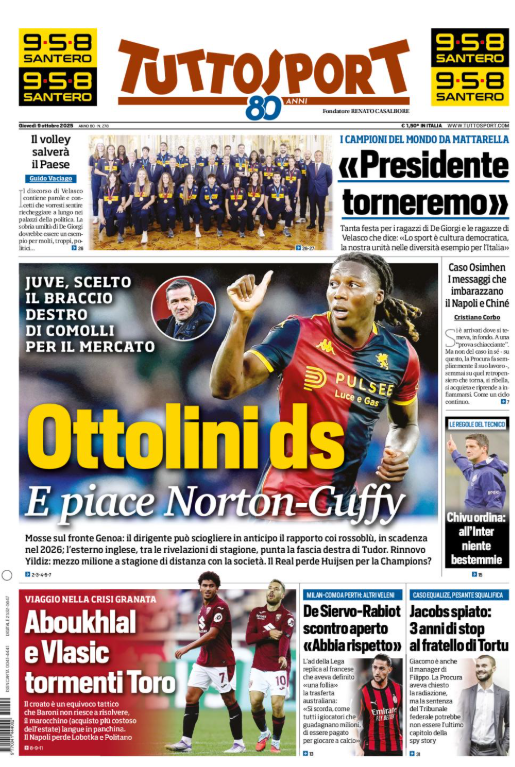 Questa è la prima pagina del 'Tuttosport', in edicola oggi, giovedì 9 ottobre 2025. Diamo un’occhiata alle principali novità sul mondo dello sport e in particolare del calcio, cercando di evidenziare le notizie sul Milan.