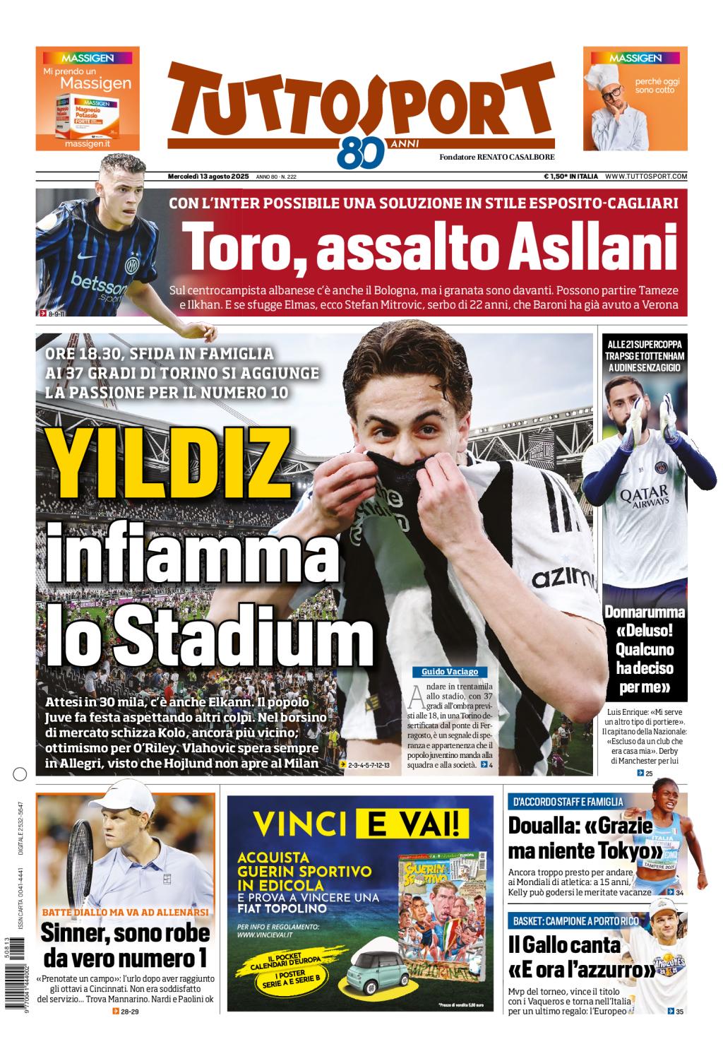 In alto, sotto la testata, si parla del Torino: nel ruolo di playmaker davanti alla difesa potrebbe arrivare l'albanese Kristjan Asllani dall'Inter, sul quale c'è anche il Bologna. E come esterno, occhio a Stefan Mitrović, che l'allenatore Marco Baroni ha già avuto alle sue dipendenze nell'Hellas Verona. Il PSG ha scaricato Gianluigi Donnarumma: il tecnico Luis Enrique vuole un altro portiere e punta dunque a cederlo ora. L'ex rossonero, sui social, si è sfogato nel suo ringraziamento ai tifosi parigini.