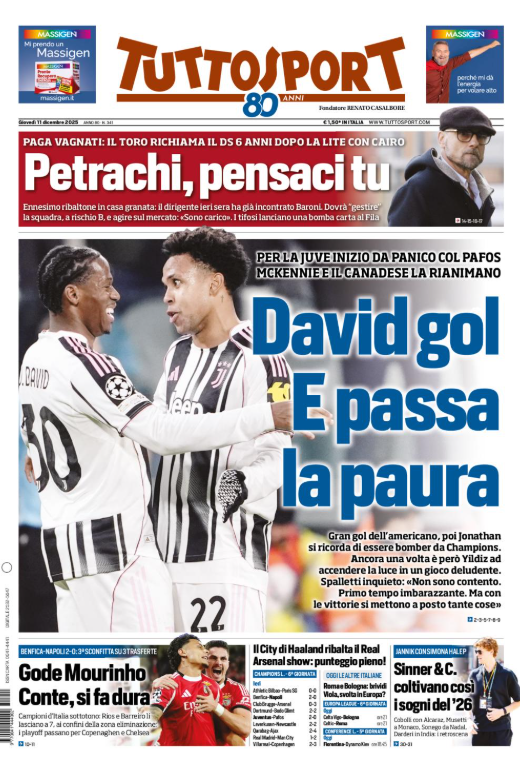 La prima pagina di 'Tuttosport' apre con con apre con la Champions League. La Juventus vince con il Pafos: "David gol e passa la paura". Il Napoli cade con il Benfica: "Gode Mourinho, Napoli si fa dura". Petrachi pensaci tu. Bologna, Roma e Fiorentina in Europa. Ecco la prima pagina di 'Tuttosport'.