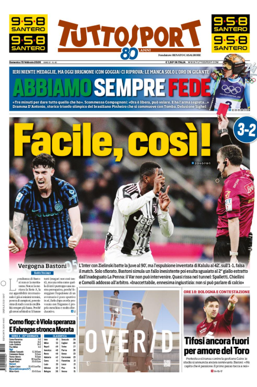 Prima pagina Tuttosport: “Facile, così! Espulsione inventata per Kalulu. Vergogna Bastoni”