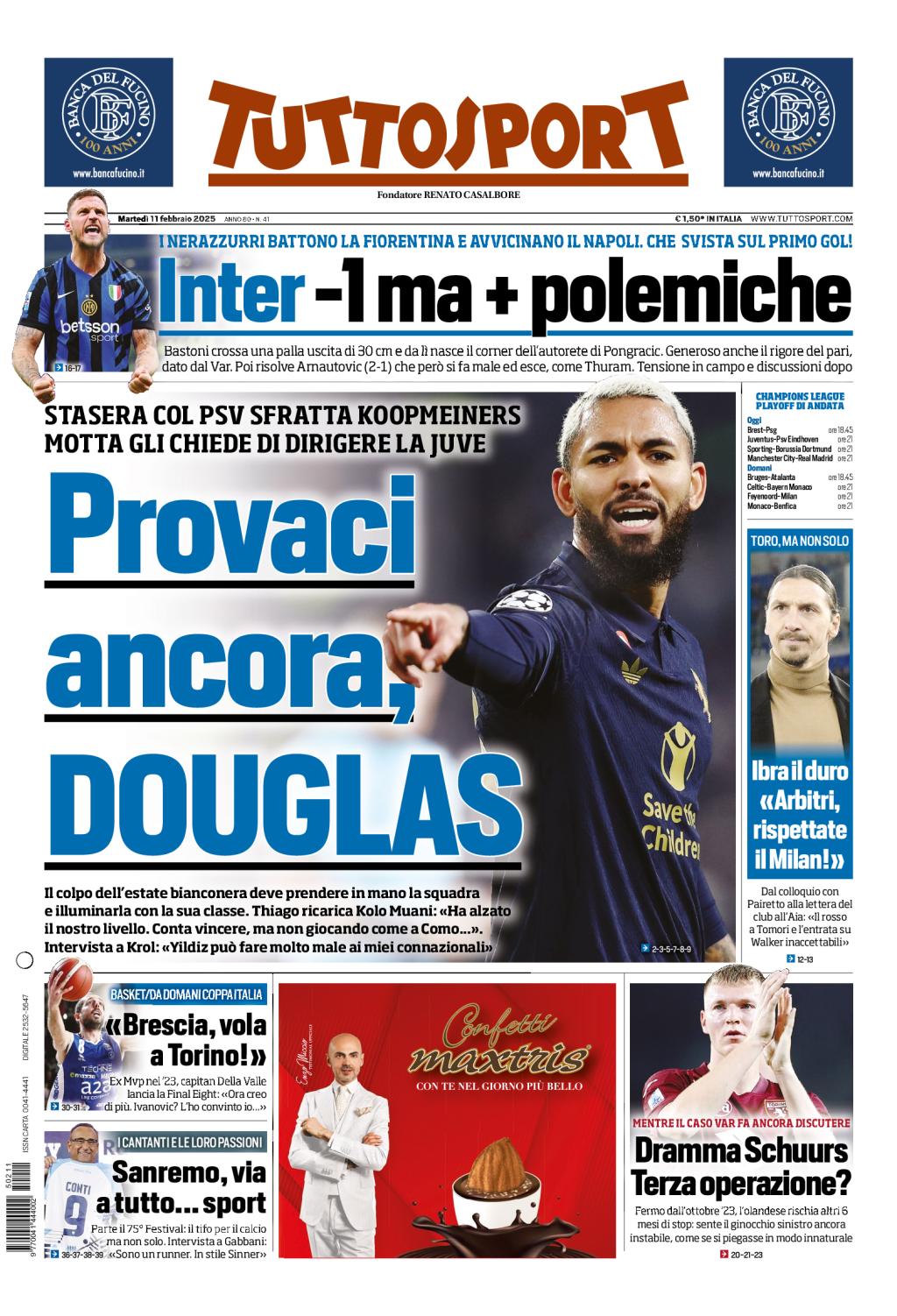 In alto, sotto la testata, si parla delle tante polemiche sorte in seguito a Inter-Fiorentina, 'Monday Night' della 24^ giornata della Serie A 2024-2025 terminato 2-1 per i nerazzurri. Gara decisa da un gol di Marko Arnautovic, che consente alla squadra di Simone Inzaghi di andare a - 1 dal Napoli, ma aperta da una rete irregolare. Non c'era, infatti, il corner per l'Inter da cui scaturisce l'autogol di Marin Pongračić.