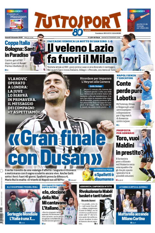 Questa è la prima pagina del 'Tuttosport', in edicola oggi, venerdì 5 dicembre 2025. Diamo un’occhiata alle principali novità sul mondo dello sport e in particolare del calcio, cercando di evidenziare le notizie sul Milan.