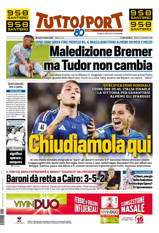 Questa è la prima pagina del 'Tuttosport', in edicola oggi, martedì 14 ottobre 2025. Diamo un’occhiata alle principali novità sul mondo dello sport e in particolare del calcio, cercando di evidenziare le notizie sul Milan.