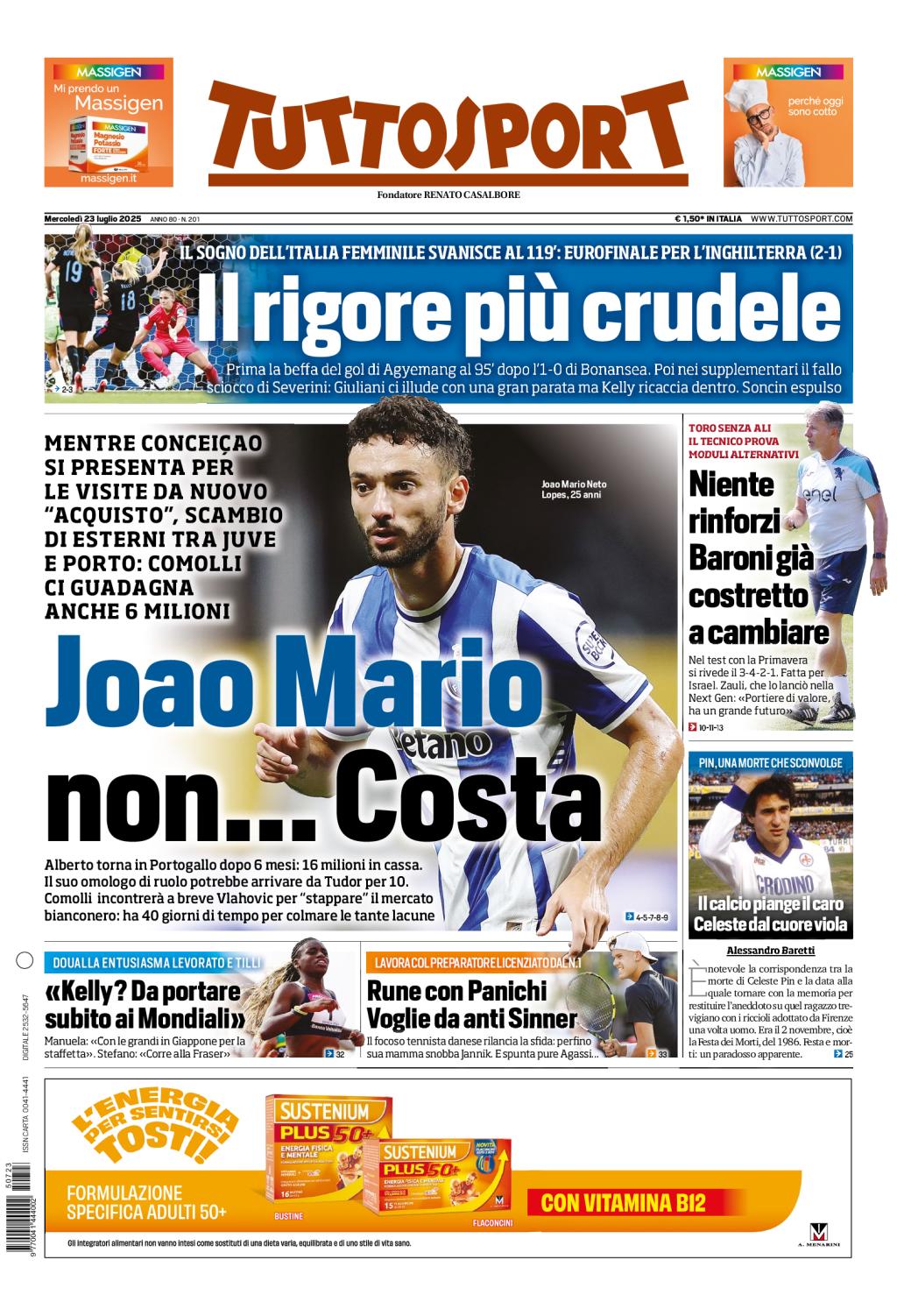 Il Torino è senza ali, rinforzi dal mercato non arrivano e il nuovo allenatore, Marco Baroni, si trova costretto a cambiare modulo. La Fiorentina e il calcio piangono Celeste Pin, ex giocatore viola, suicidatosi nella giornata di ieri. Agli Europei di calcio femminile, invece, sconfitta (1-2) per l'Italia contro l'Inghilterra. Beffarda, su calcio di rigore nel finale dei tempi supplementari.