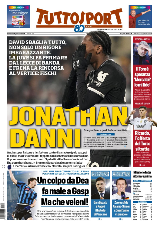 La prima pagina di 'Tuttosport' apre con il pareggio della Juventus contro il Lecce. Jonathan Danni. Il Toro è speranza. Un colpo da Dea fa male a Gasperini. Ecco la prima pagina di 'Tuttosport'.