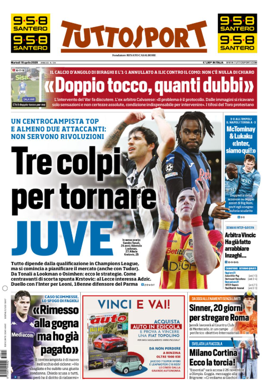 La prima pagina del 'Corriere dello Sport' apre con il calciomercato della Juventus. Tre colpi per tornare. Le strategie per Tonali, Lookman e Krstovic. Tanti dubbi arbitrali in Como-Torino. McTominay e Lukaku rispondono all'Inter. Parla Fagioli. Ecco la prima pagina di 'Tuttosport'.