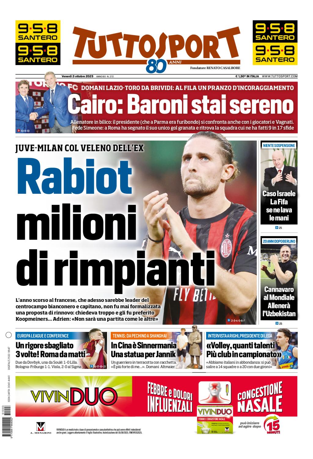 In alto, sotto la testata, si parla di Lazio-Torino, in programma domani, sabato 4 ottobre, alle ore 15:00, per la 6^ giornata della Serie A 2025-2026. Questo perché, in un pranzo avvenuto ieri al 'Filadelfia', il Presidente Urbano Cairo ha tranquillizzato Marco Baroni, allenatore del Torino, sulle innumerevoli voci di esonero che si rincorrono nelle ultime ore.