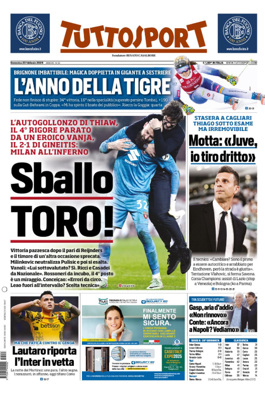 Questa è la prima pagina di 'Tuttosport', in edicola oggi, domenica 23 febbraio 2025. Diamo un’occhiata alle principali novità sul mondo dello sport e in particolare del calcio, cercando di evidenziare le notizie sul Milan.
