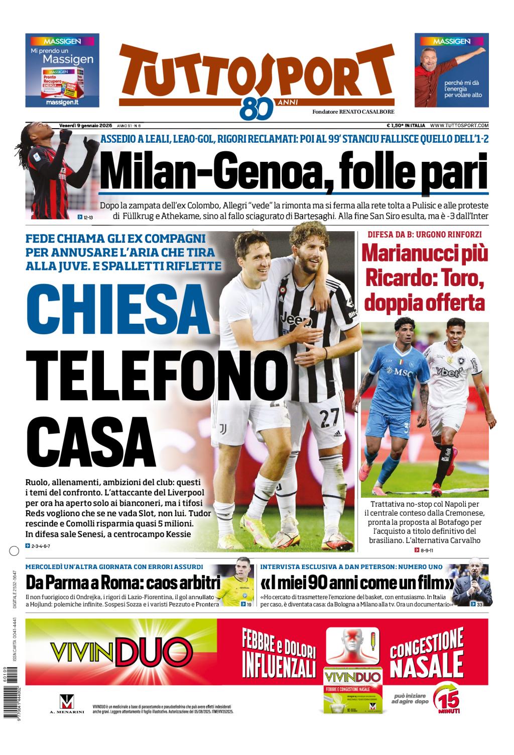 Il Torino, nel calciomercato invernale, vuole rinforzarsi in difesa. Duplice offerta per Luca Marianucci (Napoli) e il brasiliano Ricardo (Botafogo), ma ciò che tiene banco è il caos arbitri: da Parma a Roma, errori in serie tra campo e V.A.R.. Auguri, infine, a coach Dan Peterson per i suoi 90 anni.