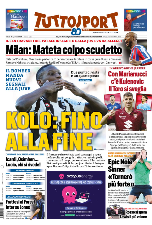 Questa è la prima pagina del 'Tuttosport', in edicola oggi, sabato 31 gennaio 2026. Diamo un’occhiata alle principali novità sul mondo dello sport e in particolare del calcio, cercando di evidenziare le notizie sul Milan.