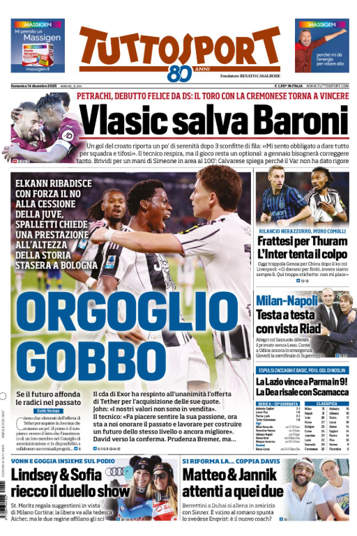 Questa è la prima pagina del 'Tuttosport', in edicola oggi, domenica 14 dicembre 2025. Diamo un’occhiata alle principali novità sul mondo dello sport e in particolare del calcio, cercando di evidenziare le notizie sul Milan.
