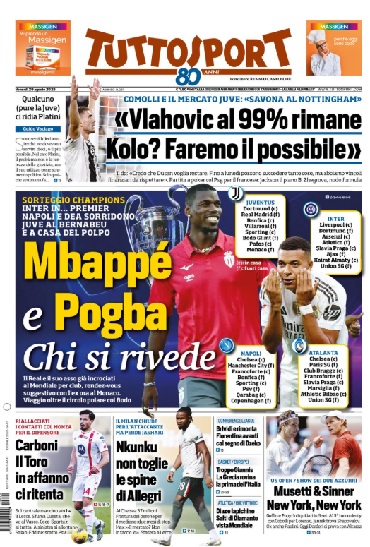 Questa è la prima pagina del 'Tuttosport', in edicola oggi, venerdì 29 agosto 2025. Diamo un’occhiata alle principali novità sul mondo dello sport e in particolare del calcio, cercando di evidenziare le notizie sul Milan.