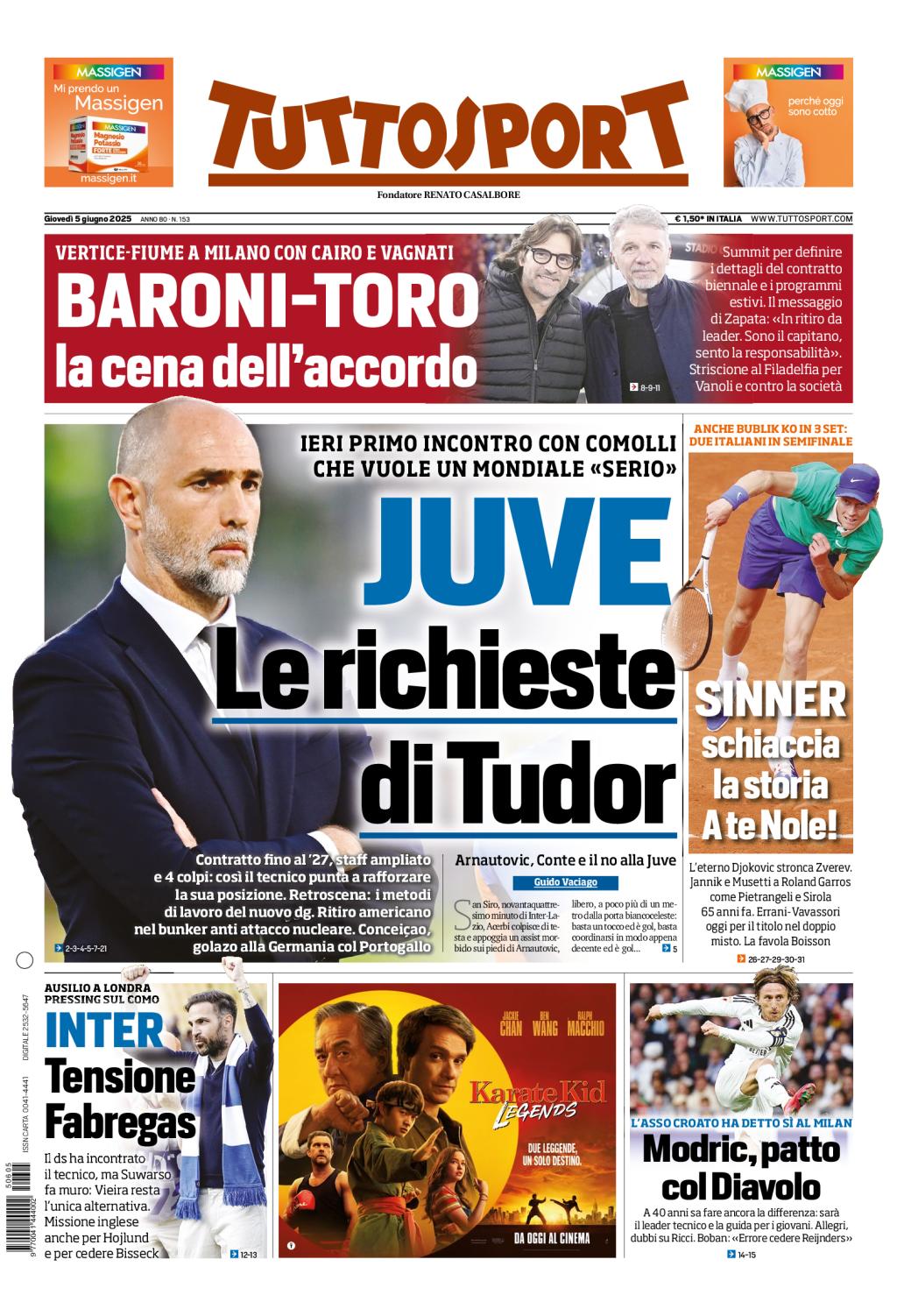 Vertice fiume, ieri, a Torino, tra il Presidente granata Urbano Cairo, il direttore sportivo Davide Vagnati e Marco Baroni: sarà lui il nuovo allenatore del Toro, in sostituzione di Paolo Vanoli. All'Inter, invece, sono in pressing sul Como per liberare Cesc Fàbregas, deputato a rimpiazzare Simone Inzaghi. I lariani fanno però muro. Alternativa per i nerazzurri è Patrick Vieira.