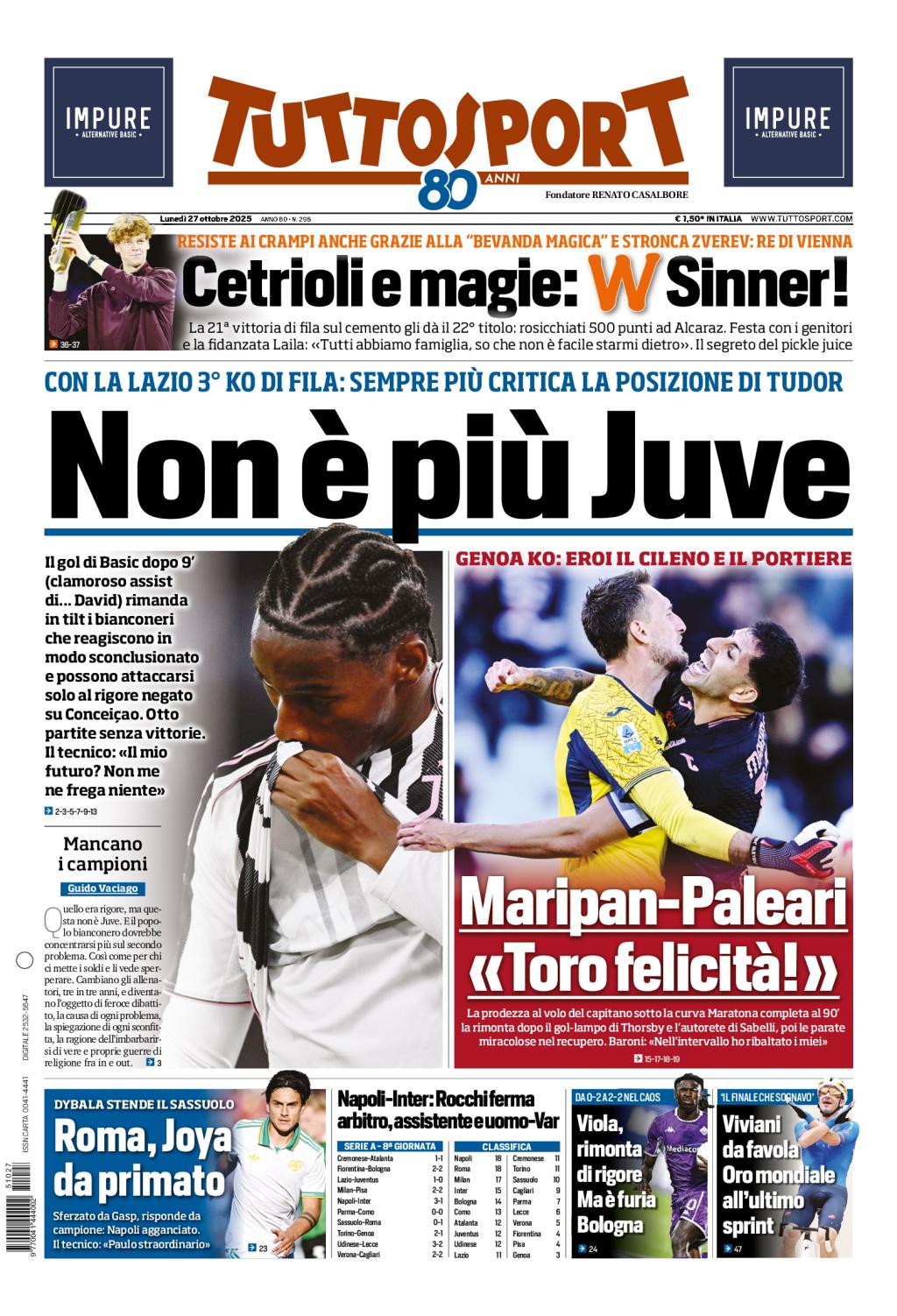 Vince il Torino di Marco Baroni, in casa e in rimonta, per 2-1 contro il Genoa. Al 90' segna Guillermo Maripán e in pieno recupero il secondo portiere Alberto Paleari salva il risultato con un doppio miracolo. Prima in classifica in campionato, con il Napoli, c'è la Roma di Gian Piero Gasperini, che passa a Reggio Emilia contro il Sassuolo grazie a un gol di Paulo Dybala.