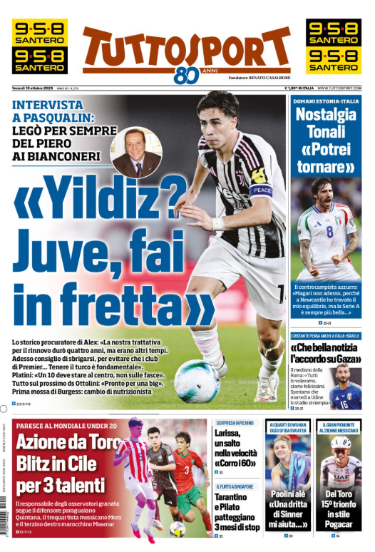 La prima pagina di 'Tuttosport' apre con l'intervista a Pasqualin sulla Juventus e Yildiz. Nostalgia Tonali: "Potrei tornare". Azione da Torino, blitz in Cile per tre talenti. Ecco la prima pagina di 'Tuttosport'.