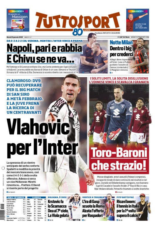 Questa è la prima pagina del 'Tuttosport', in edicola oggi, giovedì 8 gennaio 2026. Diamo un’occhiata alle principali novità sul mondo dello sport e in particolare del calcio, cercando di evidenziare le notizie sul Milan.