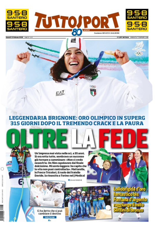 La prima pagina di 'Tuttosport' apre con le Olimpiadi e l'impresa della Brignone. Ecco la prima pagina di 'Tuttosport'.