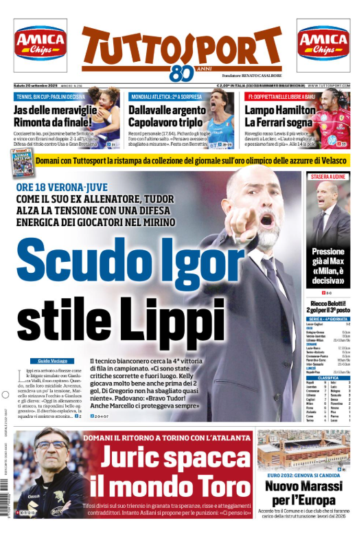 Questa è la prima pagina del 'Tuttosport', in edicola oggi, sabato 20 settembre 2025. Diamo un’occhiata alle principali novità sul mondo dello sport e in particolare del calcio, cercando di evidenziare le notizie sul Milan.