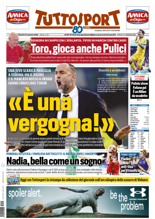 Questa è la prima pagina del 'Tuttosport', in edicola oggi, domenica 21 settembre 2025. Diamo un’occhiata alle principali novità sul mondo dello sport e in particolare del calcio, cercando di evidenziare le notizie sul Milan.