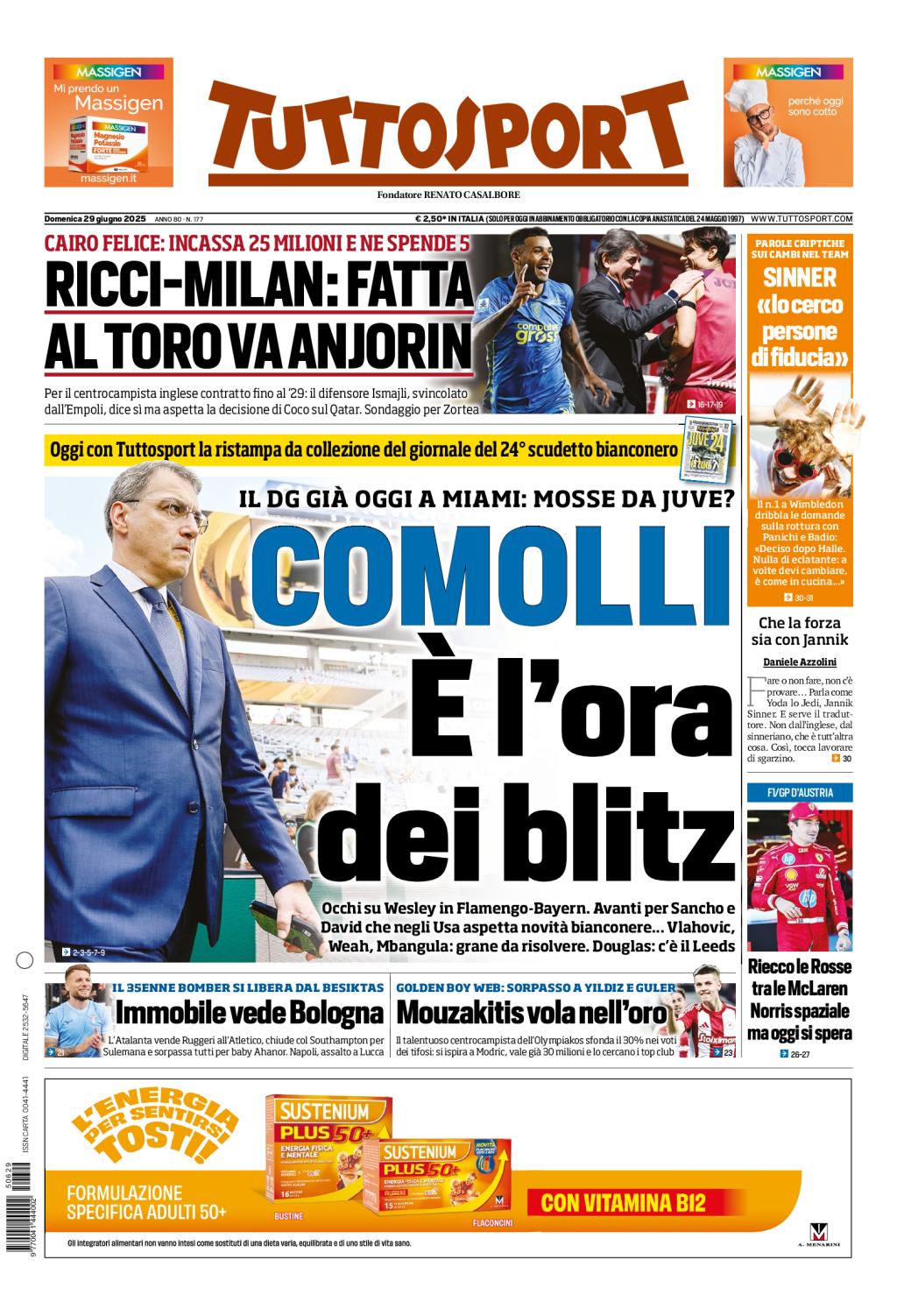 Il Torino cede Samuele Ricci al Milan per 25 milioni di euro (al centrocampista contratto fino al 30 giugno 2029) e ne reinveste 5 per Faustino Anjorin, centrocampista dell'Empoli. Lo svincolato Ardian Ismajli potrebbe invece rimpiazzare Saúl Coco, in uscita verso il Qatar. Sondaggio granata, intanto, per Nadir Zortea. Il Bologna mette le mani su Ciro Immobile, che si libera dal Beşiktaş, mentre Chrīstos Mouzakitīs, centrocampista classe 2006 dell'Olympiacos, scala la classifica del 'Golden Boy Web'.