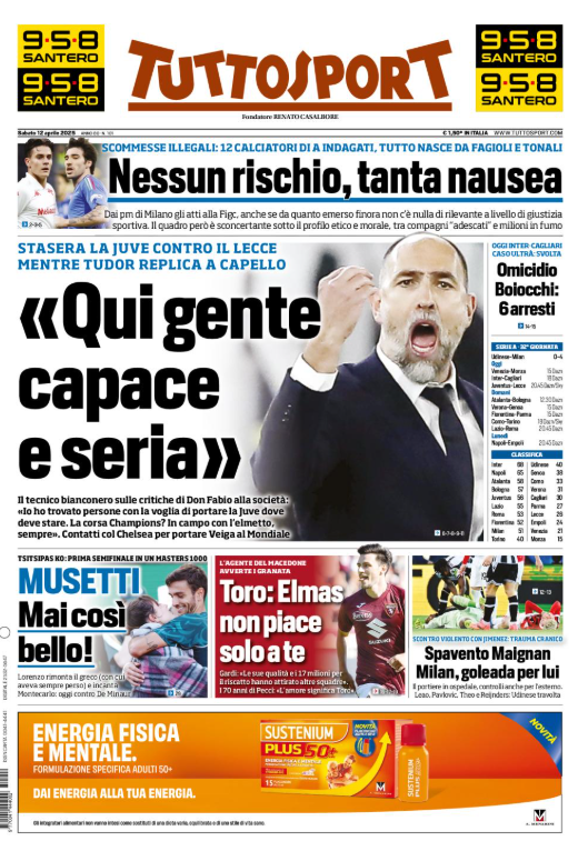 La prima pagina di 'Tuttosport' apre con con la Juventus. Parla Tudor: "Qui gente capace e seria". Scommesse illegali, 12 calciatori indagati. Nessun rischio, tanta nausea. Torino, Elmas non piace solo a te. Spavento Maignan. Milan, goleada per lui. 4-0 all'Udinese. Ecco la prima pagina di 'Tuttosport'.