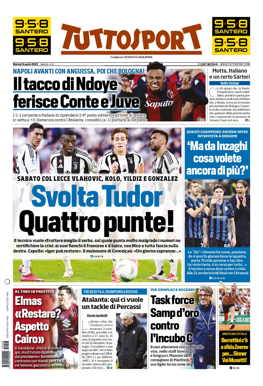 'Tuttosport' si apre con la sfida di Champions League tra Inter e Bayern Monaco, valevole per l'andata dei quarti di finale della massima competizione europea. Nella parte alta si parla del big match di Serie A tra Bologna e Napoli, terminato 1-1 con i rossoblù che hanno giocato decisamente meglio degli avversari. Spazio, poi, alla nuova Juventus di Igor Tudor, all'Atalanta e alle parole di Eljif Elmas sul Torino.