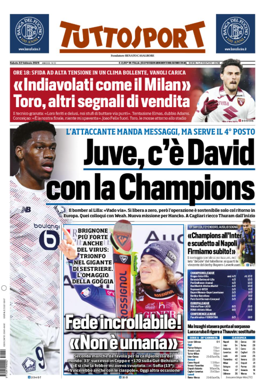 Questa è la prima pagina di 'Tuttosport', in edicola oggi, sabato 22 febbraio 2025. Diamo un’occhiata alle principali novità sul mondo dello sport e in particolare del calcio, cercando di evidenziare le notizie sul Milan.