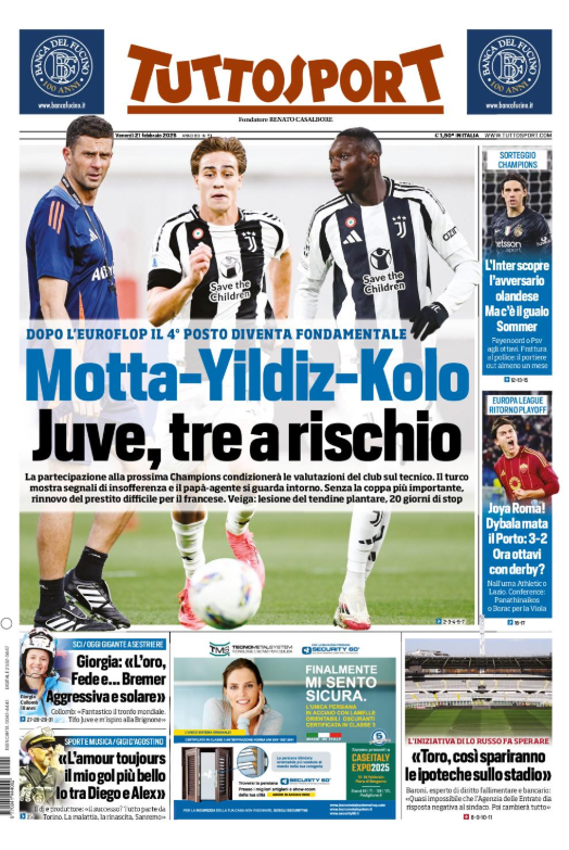 Questa è la prima pagina di 'Tuttosport', in edicola oggi, venerdì 21 febbraio 2025. Diamo un’occhiata alle principali novità sul mondo dello sport e in particolare del calcio, cercando di evidenziare le notizie sul Milan.