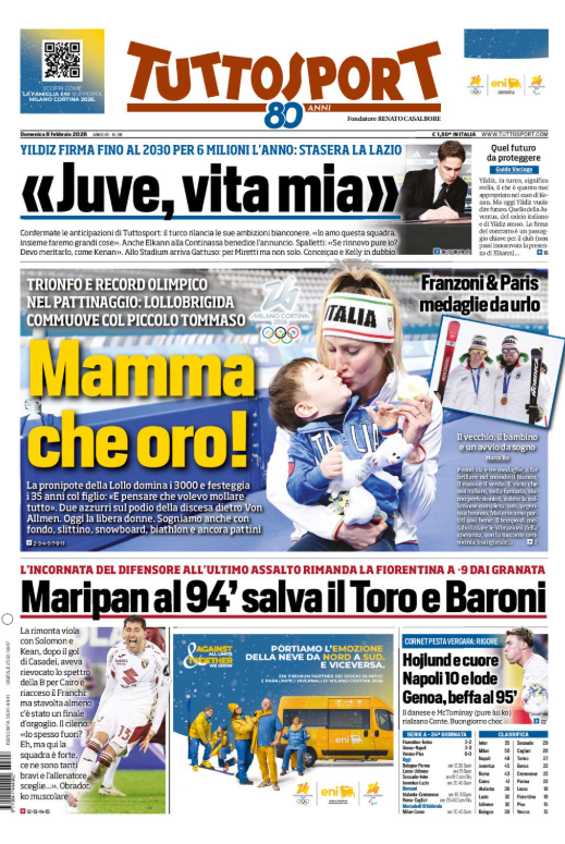 La prima pagina di 'Tuttosport' apre con le Olimpiadi invernali: "Mamma che oro". Il rinnovo di Yildiz con la Juventus. Maripan salva il Torino. Il Napoli vince. Beffa Genoa. Ecco la prima pagina di 'Tuttosport'.