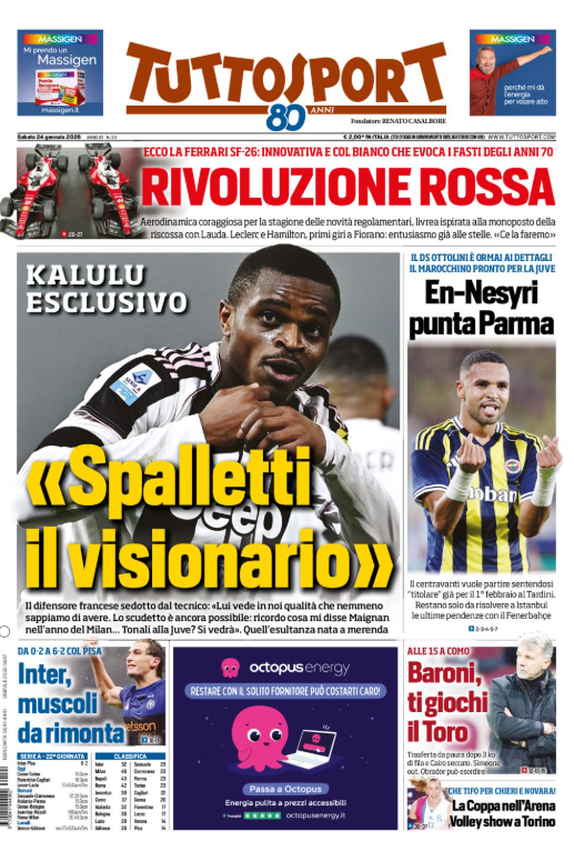 La prima pagina di 'Tuttosport' apre con l'intervista Pierre Kalulu. Inter, muscoli da rimonta. 6-2 contro il Pisa. Juventus, En-Nesyri punta il Parma. Baroni ti giochi il Toro. Ecco la prima pagina di 'Tuttosport'.