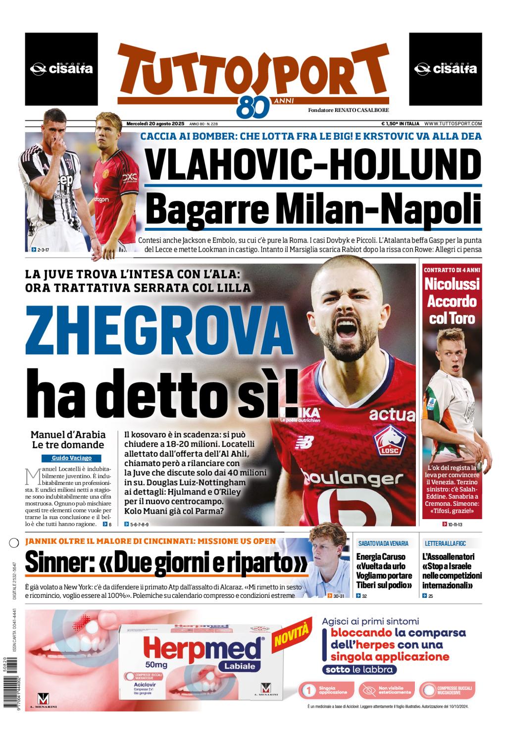 In alto, sotto la testata, si parla di 'bagarre' tra Milan e Napoli per Dušan Vlahović e Rasmus Højlund. Destini incrociati per i due attaccanti: chi prende l'uno, lascia l'altro all'avversario. O viceversa. Contesi anche Nicolas Jackson (Chelsea) e Breel Embolo (Monaco). Nikola Krstović passa dal Lecce all'Atalanta.