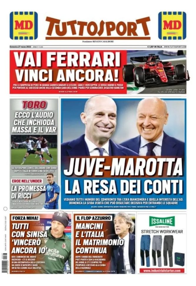 L'edizione odierna di 'Tuttosport' apre con il confronto tra l'era bianconera e quella nerazzurra dell'a.d. Beppe Marotta. E intanto, domenica prossima, Juventus e Inter si sfideranno per quella che sarà un'entusiasmante sfida per un posto in Champions League.