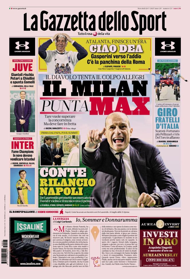 'La Gazzetta dello Sport' oggi in edicola, in prima pagina, apre con il tentativo del Milan di riportare in panchina Massimiliano Allegri. Il direttore sportivo dei rossoneri, Igli Tare, vuole superare la concorrenza per l'allenatore livornese, ma deve fare in fretta. Gian Piero Gasperini dice addio all'Atalanta: quasi tutto fatto per il suo approdo alla Roma.
