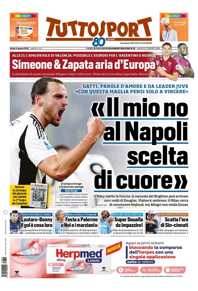 Infine, 'Tuttosport' oggi in edicola, in prima pagina, apre con l'intervista in esclusiva a Federico Gatti, difensore centrale della Juventus, nella quale spiega le ragioni del suo 'no' al Napoli di Antonio Conte. È un po' ombroso Dušan Vlahović, che vede il Milan cercare di convincere Rasmus Højlund a vestire la maglia rossonera. Ma Massimiliano Allegri, allenatore del Diavolo, non molla il serbo.