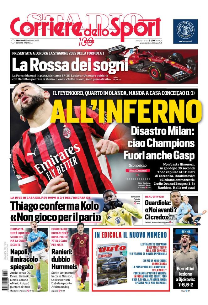Il 'Corriere dello Sport' oggi in edicola, in prima pagina, apre parlando del disastro compiuto dal Milan di Sérgio Conceição che, in occasione della partita di ritorno dei playoff della Champions League 2024-2025 a 'San Siro' contro il Feyenoord, non va oltre l'1-1 e, pertanto, manca la qualificazione agli ottavi della competizione.