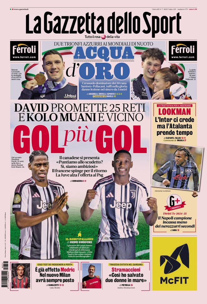 'La Gazzetta dello Sport' oggi in edicola, in prima pagina, dedica ampio spazio alla Juventus. In particolare, alle parole del nuovo arrivo Jonathan David, che promette 25 reti e alla trattativa con il PSG per riportare in bianconero un altro attaccante, Randal Kolo Muani.