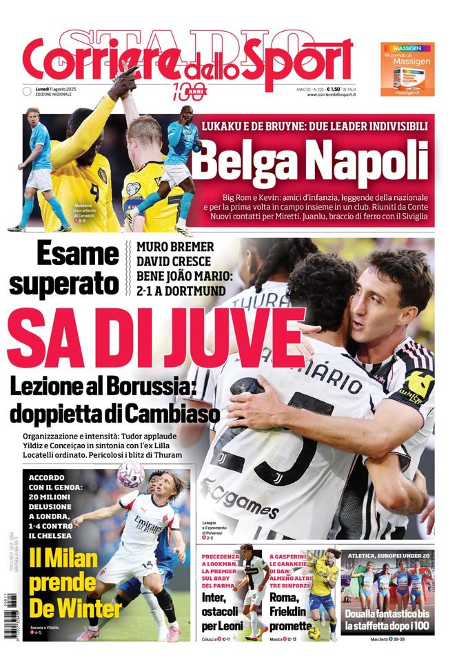 Il 'Corriere dello Sport' oggi in edicola, in prima pagina, apre parlando della bella vittoria, 1-2, della Juventus in casa del Borussia Dortmund nell'amichevole in Germania: decide una doppietta di Andrea Cambiaso. In alto, sotto la testata, si parla della crescita del Napoli 'belga': l'intesa tra Romelu Lukaku e il nuovo arrivato Kevin De Bruyne cresce partita dopo partita.