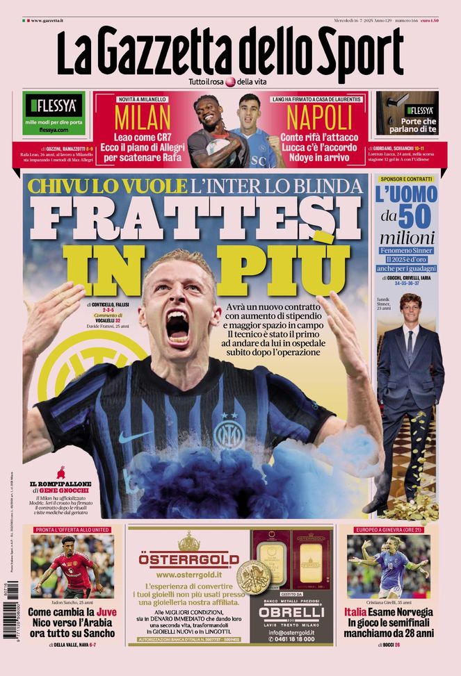 Le prime pagine dei quotidiani sportivi in edicola oggi, mercoledì 16 luglio 2025. Rassegna con le news su calcio, Milan e calciomercato