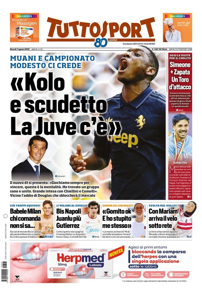 Infine, 'Tuttosport' oggi in edicola, in prima pagina, apre con le parole di François Modesto, direttore sportivo della Juventus. Ha parlato di grande unità con Giorgio Chiellini e con il direttore generale Damien Comolli, nonché detto di credere allo Scudetto. Fiducioso per il ritorno di Randal Kolo Muani dal PSG, la cessione di Douglas Luiz sbloccherà il calciomercato.