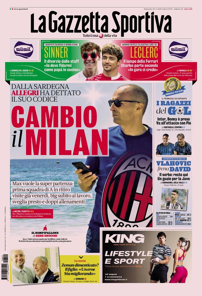 'La Gazzetta dello Sport' oggi in edicola, in prima pagina, apre parlando del nuovo codice di Massimiliano Allegri per il Milan, che sarà la prima squadra di Serie A ad andare in ritiro. Visite mediche venerdì, big subito al lavoro, sveglia presto e doppi allenamenti agli ordini dell'allenatore livornese.