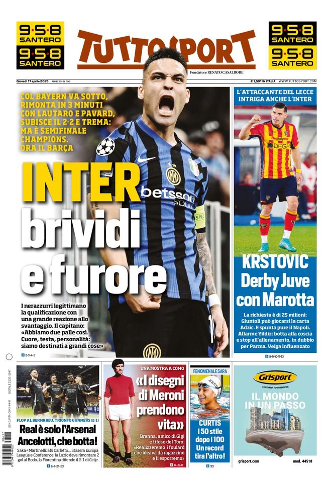 Infine, 'Tuttosport' oggi in edicola, in prima pagina, apre parlando di Inter-Bayern Monaco, ritorno dei quarti di finale della Champions League 2024-2025: grazie al 2-2 maturato a 'San Siro' e in virtù della vittoria nella partita di andata in Germania, i nerazzurri di Simone Inzaghi si qualificano per le semifinali.