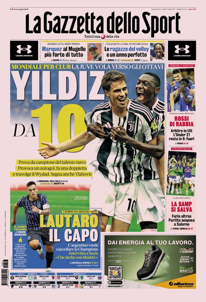 'La Gazzetta dello Sport' oggi in edicola, in prima pagina, apre parlando del 4-1 con cui la Juventus di Igor Tudor ha spazzato via i marocchini del Wydad Casablanca al Mondiale per Club. Protagonista assoluto, il gioiello turco Kenan Yıldız, autore di una doppietta e di un autogol procurato. A segno anche Dušan Vlahović su calcio di rigore.