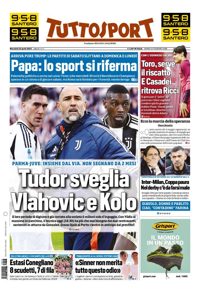 Infine, 'Tuttosport' oggi in edicola, in prima pagina presenta Parma-Juventus, recupero della 33^ giornata della Serie A 2024-2025 che si disputerà alle ore 18:30 allo stadio 'Tardini'. Per l'occasione, Igor Tudor, allenatore dei bianconeri, lancerà la coppia d'attacco composta da Dušan Vlahović e Randal Kolo Muani: non segnano da due mesi.