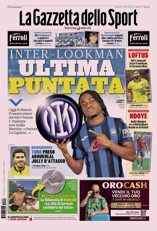 'La Gazzetta dello Sport' oggi in edicola, in prima pagina, apre parlando della trattativa che potrebbe portare Ademola Lookman dall'Atalanta all'Inter in questa sessione estiva di calciomercato. Atteso in giornata il rilancio dei meneghini: potrebbero essere decisivi i bonus nell'operazione.