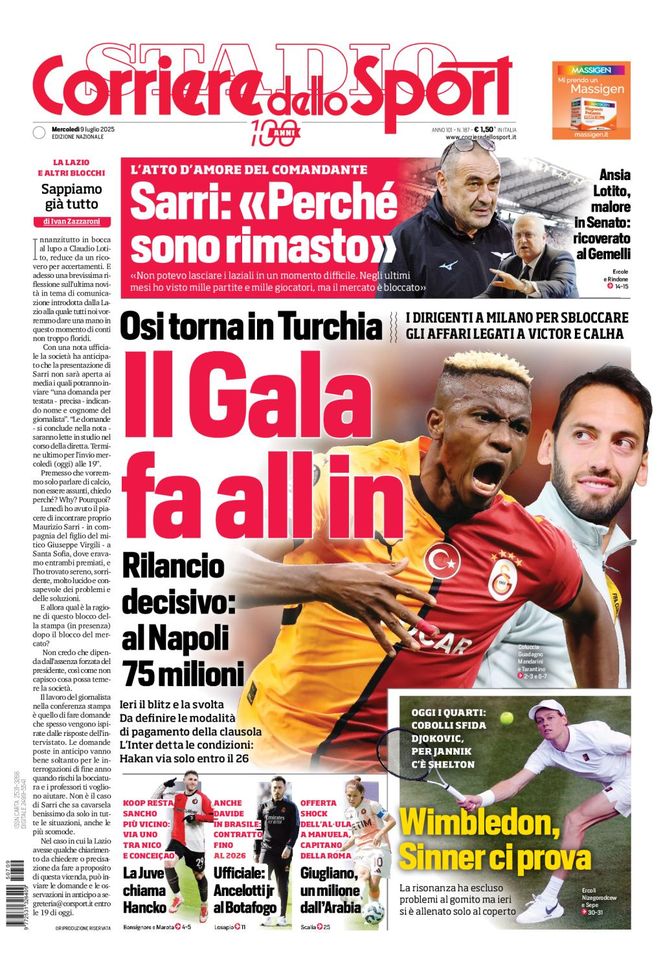 Il 'Corriere dello Sport' oggi in edicola, in prima pagina, apre parlando di calciomercato e, più nello specifico, dell'arrivo dei dirigenti del Galatasaray in Italia. Obiettivi: risolvere il prestito di Álvaro Morata dal Milan; prelevare Victor Osimhen dal Napoli per i 75 milioni di euro della clausola risolutoria; prendere Hakan Çalhanoğlu dall'Inter.